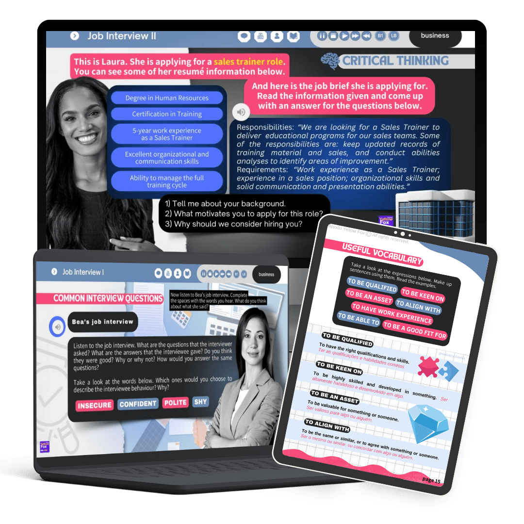 Lessons sobre Job Interview e Work Meetings para alunos intermediários, acompanhadas de slides e worksheets para homework.