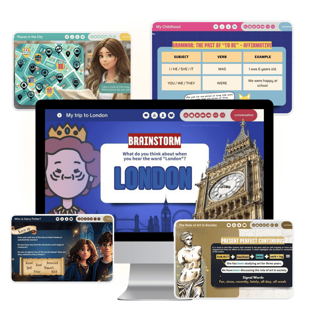 São mais de 50 lessons prontas para uso dos níveis A1 e A2, com slides e worksheets, completas de acordo com o CEFR, para você usar com alunos a partir dos 10 anos, adolescentes e adultos.