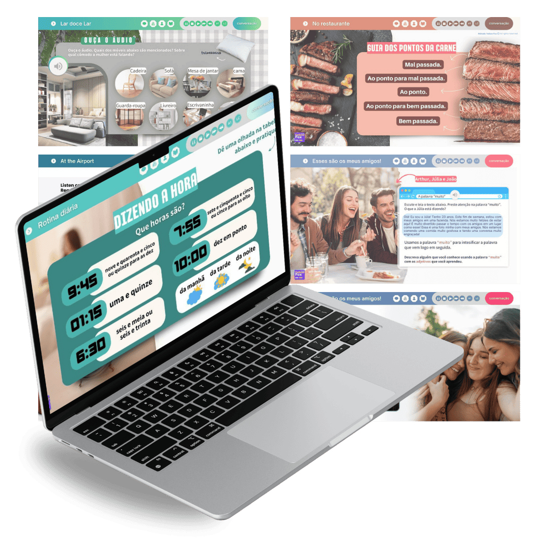 Aulas prontas para alunos estrangeiros e iniciantes de português, com oito tópicos atuais e relevantes para a comunicação do dia a dia, como No Restaurante, Rotina Diária, etc.